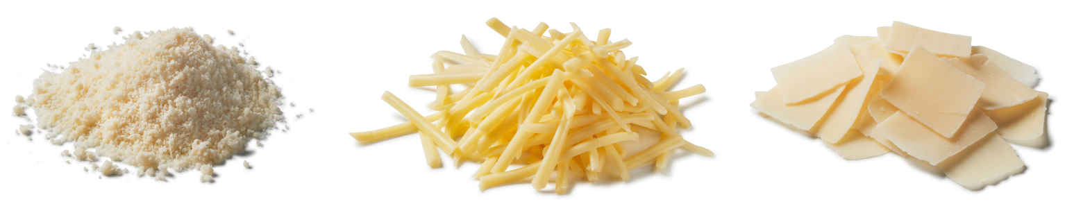 Мы не только поставляем свое оборудование для резки сыра или терки, мы предоставляем всю технологию и делимся своим опытом по подготовке и обработке сыров для достижения самого высокого качества нарезки и снижения некондиции до минимума. Мы поможем вам найти ряд оборудования и аксессуаров, которые соединяются, обмениваются и без проблем работают друг с другом: машины резки блоков, шредер для сыра, дозаторы порошка и т.п.